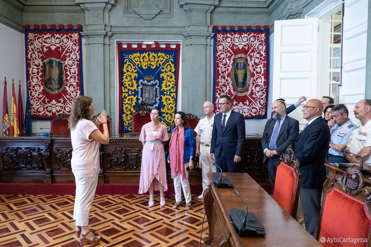 Tras recorrer las instalaciones de Navantia, y acompañada por el delegado del Gobierno, Diego Conesa, la titular de Defensa ha visitado, acto seguido, a la alcaldesa, Ana Belén Castejón, en el Palacio Consistorial, donde ha firmado en el Libro de Oro de la ciudad, y han podido tratar brevemente otros temas, como la posible construcción de la Ciudad de la Justicia en inmuebles perteneciente al Ministerio.