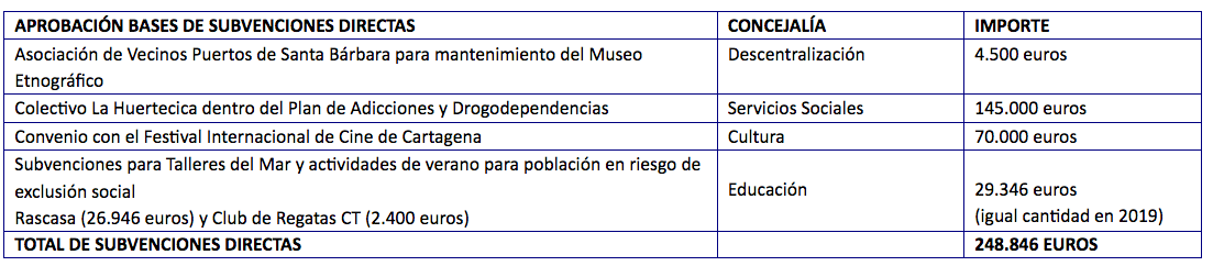 La Junta de Gobierno ha aprobado la firma de un convenio con el Festival de Cine de Cartagena (FICC), que va a suponer una aportación municipal que asciende a 70.000 euros. Del mismo modo, se ha dado luz verde a la subvención que recibe la Asociación de Vecinos de Los Puertos de Santa Bárbara de Abajo para el mantenimiento del Museo Etnográfico. Asimismo, se ha aprobado la adhesión de Cartagena al Plan Escena regional 2019, convocado por el Instituto de Industrias Culturales y las Artes, al que también podrán concurrir artistas y colectivos culturales de Cartagena.