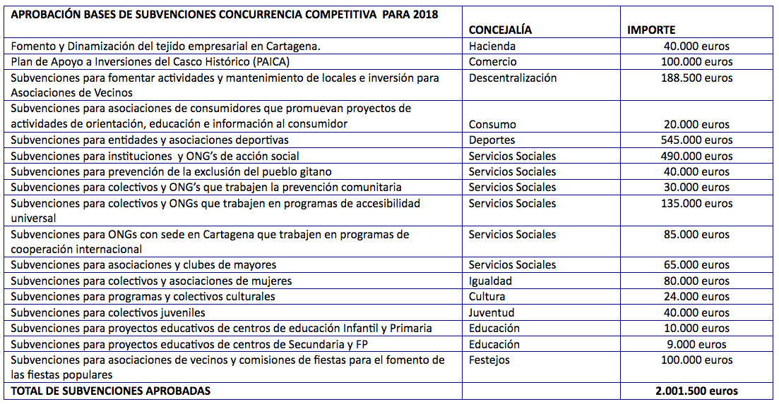 Los colectivos sociales del municipio dispondrán de cerca de un millón de euros en 2018, de los cuales 490.000 euros se destinarán a instituciones y ong’s que trabajan en acción social; 135.000 en colectivos de discapacidad; otros 145.000 euros para el colectivo de La Huertecica, enmarcado en el Plan de Adicciones y Drogodependencia, y 65.000 para clubes de mayores de Cartagena. Así como 80.000 euros para subvenciones a los colectivos de mujeres.