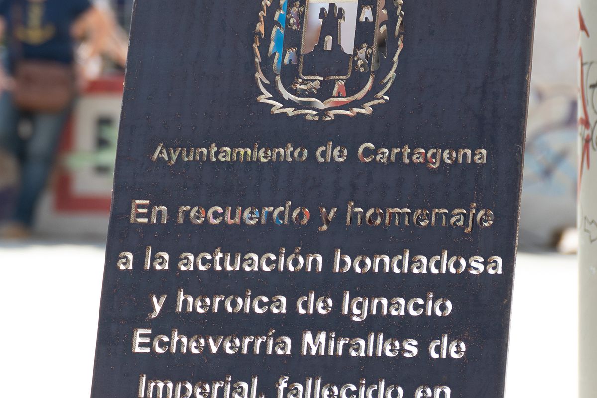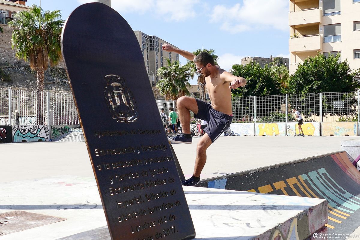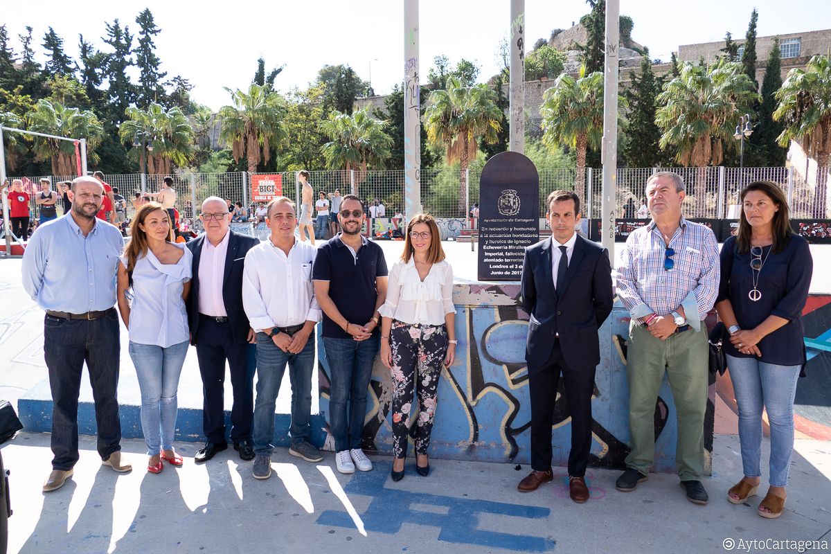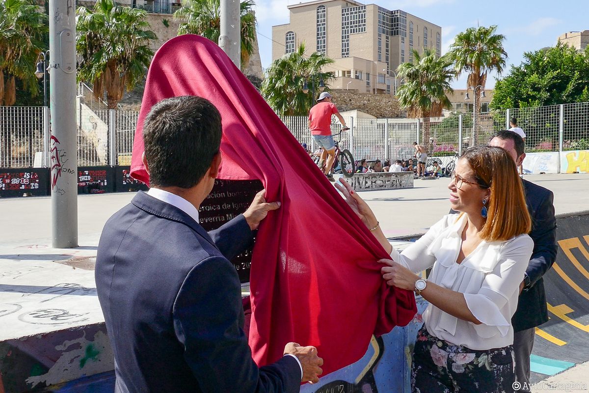 La alcaldesa de Cartagena, Ana Belén Castejón, y el amigo personal de la familia, Tomás Díaz Lago, han descubierto este sábado en la pista de skate del Parque de Deportes Urbanos en la calle Carlos III, una placa de reconocimiento a la heroica actuación del joven Ignacio Echeverría Miralles de Imperial, asesinado en Londres en junio 2017, cuando se enfrentó a unos terroristas que trataban de apuñalar a una mujer y a otros transeúntes.
