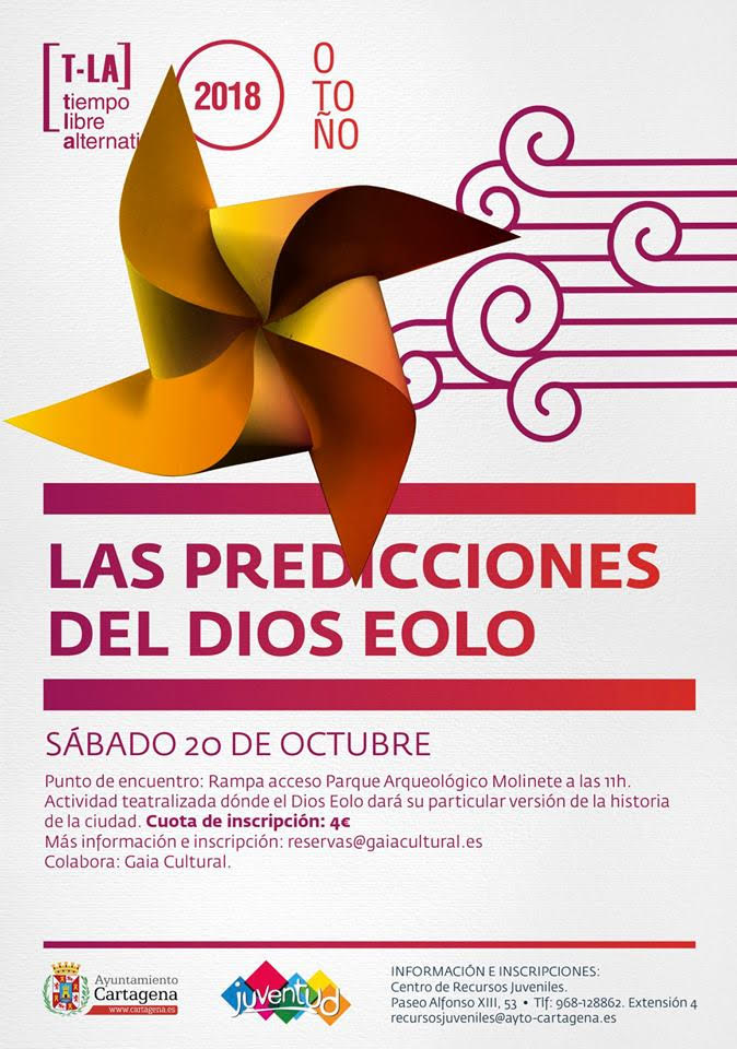 El programa de Tiempo Libre de Ocio Alternativo del Ayuntamiento ofrecerá este sábado a las 11 una actividad que brinda la oportunidad de conocer a Eolo, dios del viento, quien  mostrará cómo predice el futuro de la ciudad de Cartagena de una manera muy especial. Será en el acceso al Parque del Molinete.