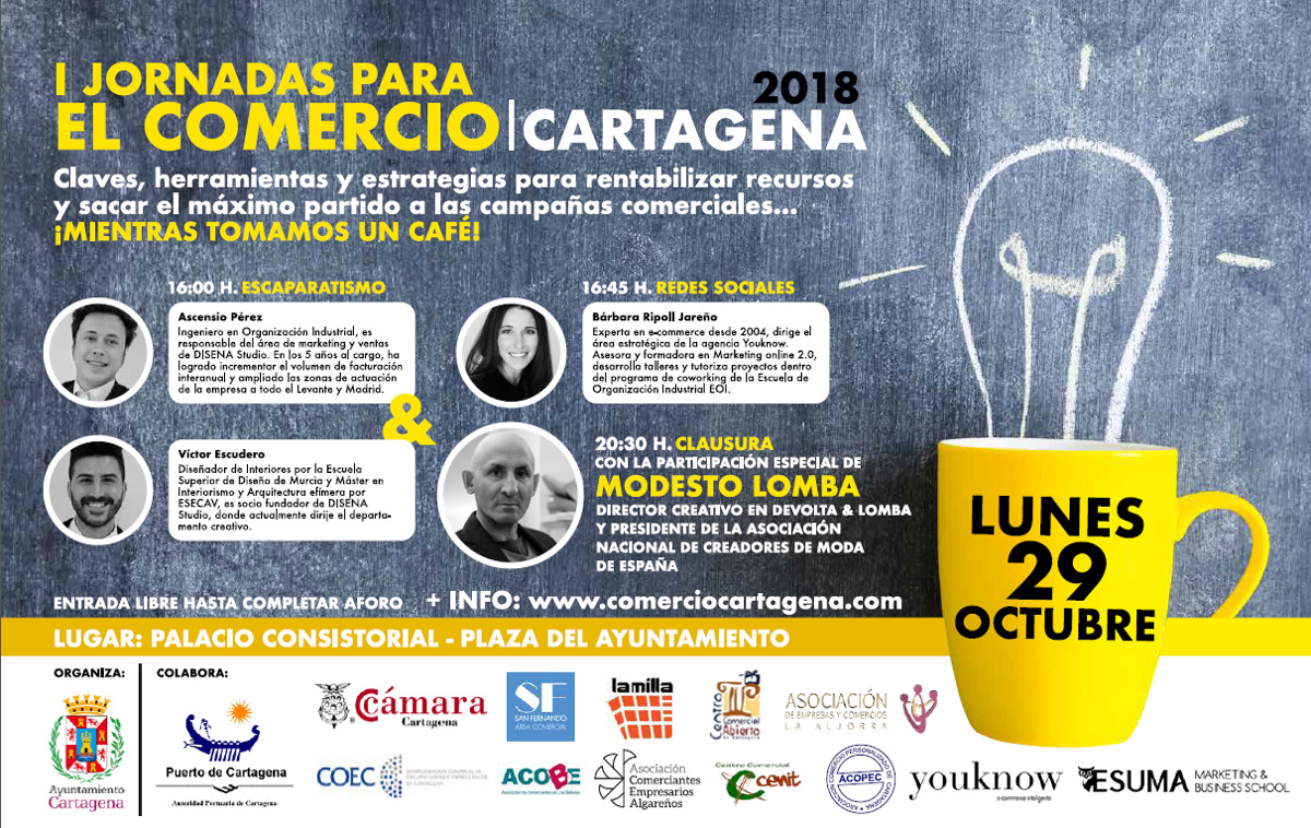 La primera de las conferencias dirigidas a los comerciantes de la Cartagena y que versará sobre las posibilidades visuales de los escaparates, tendrá inicio a las 16:00 horas. Los integrantes de Disena Studio, Ascensio Pérez y Víctor Escudero, expertos profesionales y ambos docentes de la Escuela Superior de Marketing ESUMA, serán los encargados de impartir la formación.