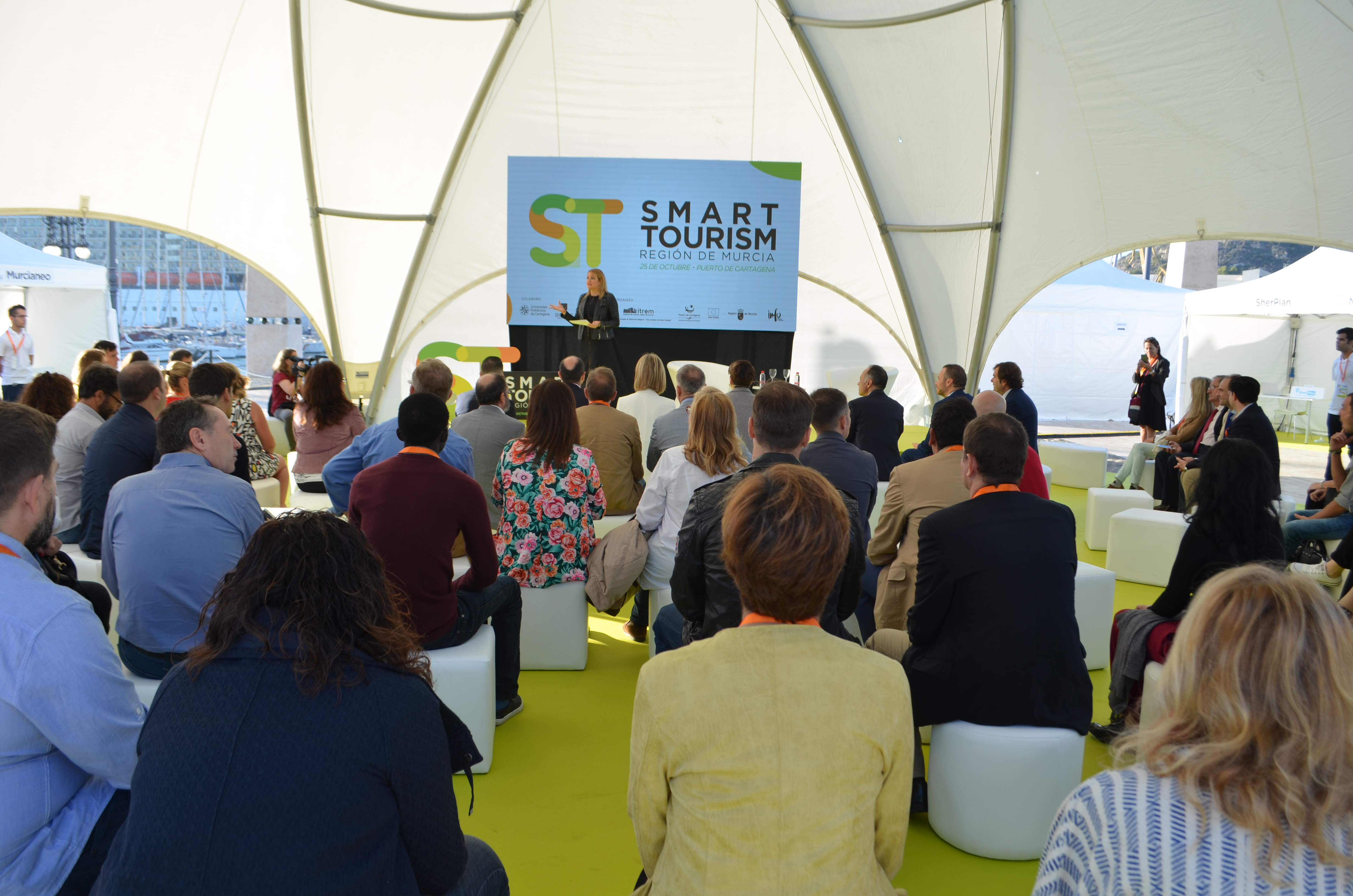 La explanada del Puerto de Cartagena acoge la jornada ‘Smart Tourism’, organizada por la Comunidad Autónoma y la Autoridad Portuaria de Cartagena y en la que se pone al alcance de empresas y asociaciones del sector turístico local, las herramientas tecnológicas desarrolladas por las empresas de la Región.