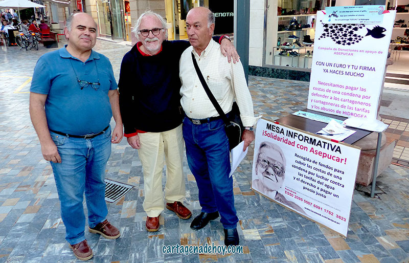 La Asociación de Afectados por los Servicios Públicos de Cartagena está recogiendo fondos para pagar las costas de una condena "por defender a los cartageneros de las tarifas y los abusos de Hidrogea", indican en la mesa que han instalado en la plaza del Icue para solicitar solidaridad ciudadana y que estará hasta el día 30 de este mes.