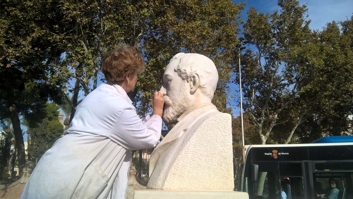 La restauradora Pilar Vallalta ha llevado a cabo la reintegración del extremo de la nariz del busto de mármol blanco del cartagenero Marcos Jiménez de la Espada, colocado en 2017 en el Paseo Alfonso XIII, junto al Instituto de Educación Secundaria de su mismo nombre.