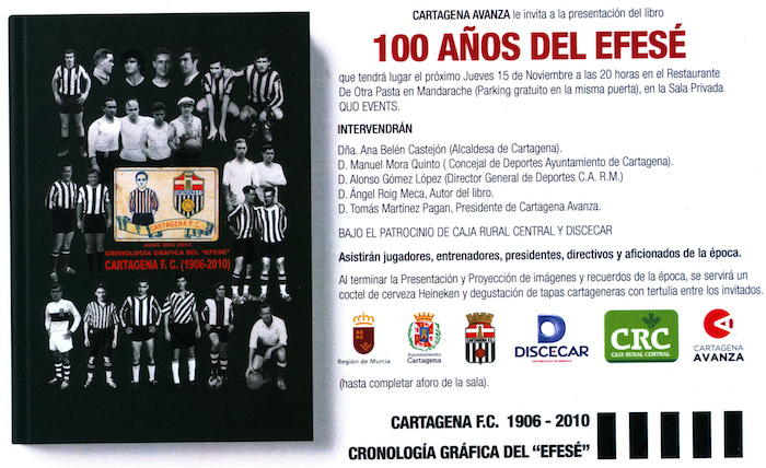 La obra de la cronología gráfica del primer equipo de fútbol cartagenero de Ángel Roig Meca será presentada este jueves, a las 20 horas, en el restaurante 'De otra pasa' en Mandarache y se anuncia presencia de autoridades y de jugadores, entrenadores, presidentes y directivos de diferentes épocas.