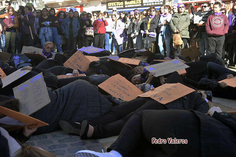 La marcha ha concluido en la plaza del Ayuntamiento, donde 44 mujeres se han tendido en el suelo con carteles en los que figuran los nombres de las mujeres asesinadas este año en España.
