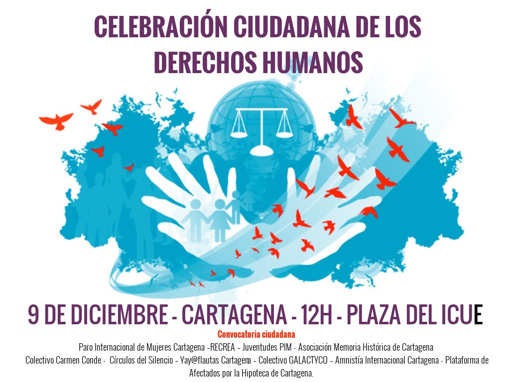Diferentes colectivos y asociaciones del entorno de Cartagena han promovido un acto en el que convocan a la ciudadanía para conmemorar el 70 aniversario de la Carta de los Derechos Humanos, que tendrá lugar el domingo 9 a las 12 horas en la plaza del Icue.