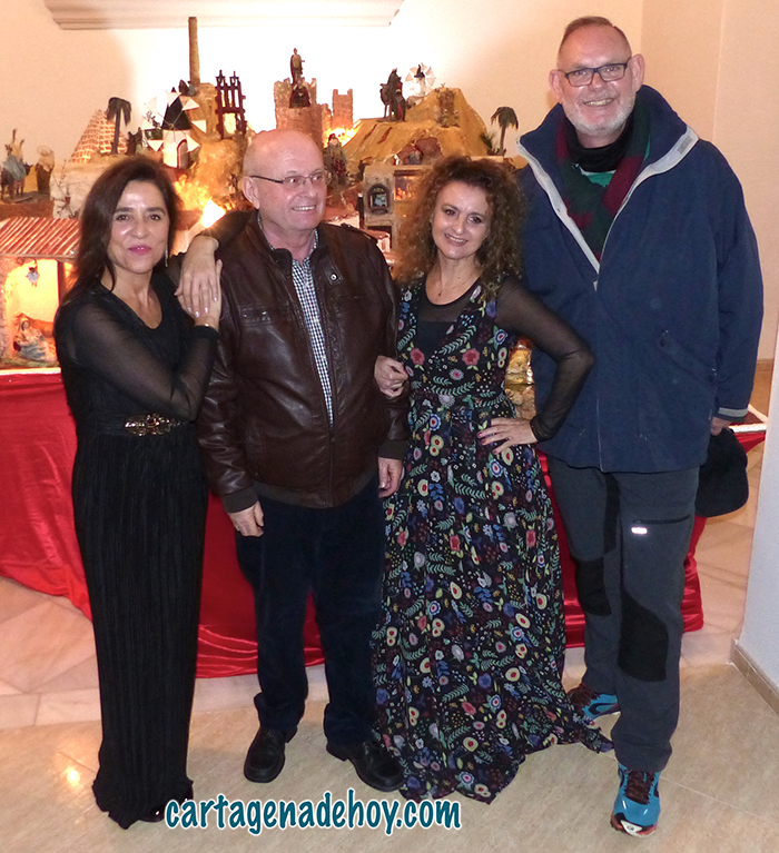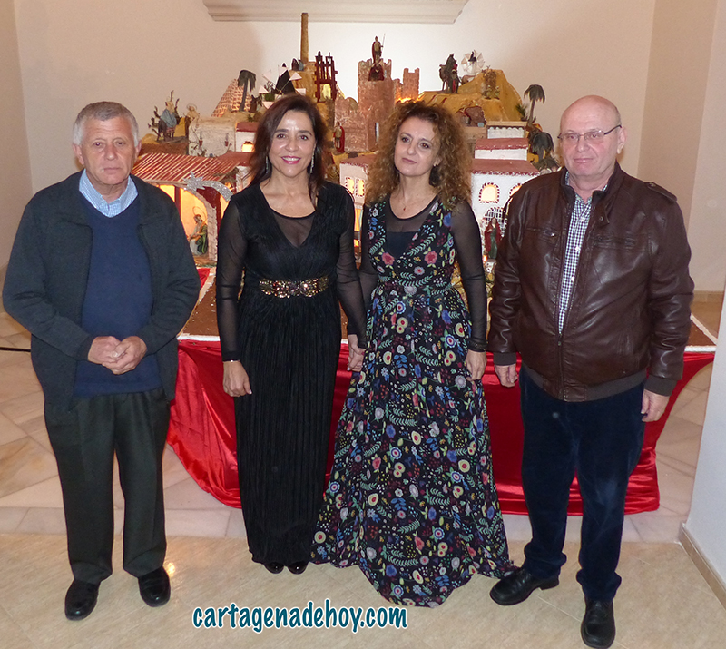 En la foto se observa a las dos sopranos entre el párroco, Andrés Ros, y el diseñador del Belén, Antonio Castejón