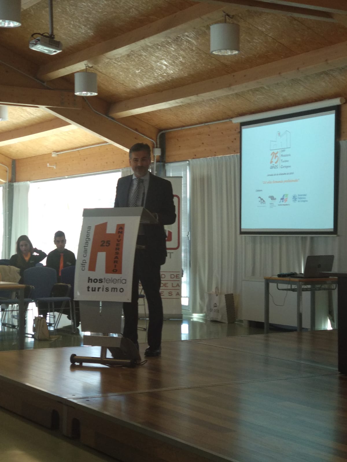 El director general de Formación Profesional y Enseñanzas de Régimen Especial, Sergio López, clausuró de la jornada ‘25 años formando profesionales’, organizada por el Centro Integrado de Hostelería y Turismo de Cartagena (CIFP) con motivo de su aniversario y que ha supuesto el comienzo de los actos programados por el centro por su 25 aniversario, estuvo orientada al profesorado, alumnos de formación profesional y equipos directivos de centros donde se imparten ciclos formativos de las familias profesionales de Hostelería y Turismo e Industrias Alimentarias, así como a los diferentes agentes sociales y asociaciones profesionales implicados en el ámbito de la hostelería.