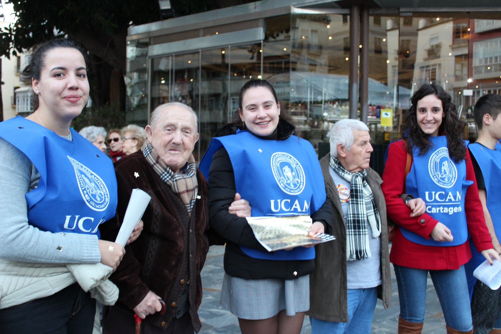 La otra acción, es la que realizan una veintena de alumnos todos los meses acompañando a los mayores del Asilo de Ancianos de las Hermanitas de los Pobres junto con el Capellán del Campus, con la que hace unos días una veintena de estudiantes acompañaron a los mayores de este centro a ver el Belén Municipal y cantar villancicos por el centro de la ciudad.