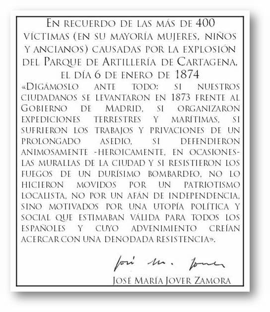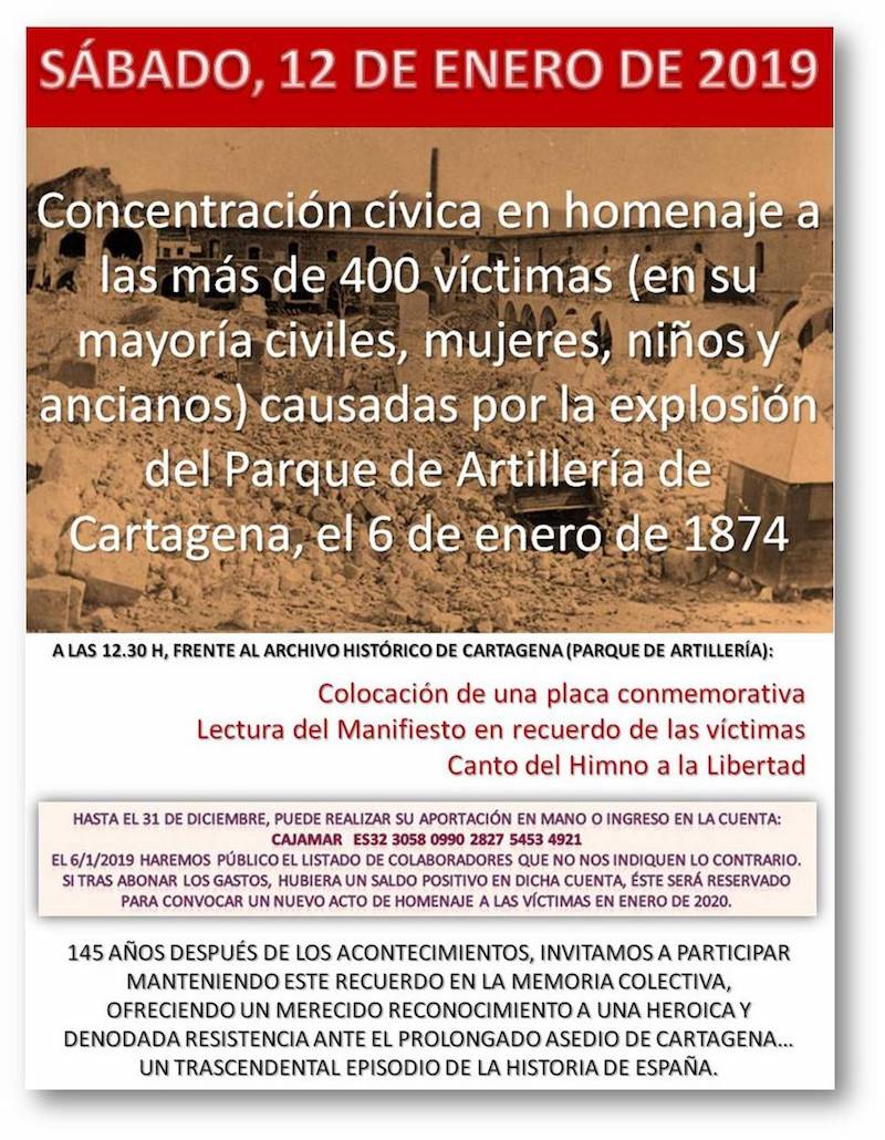 La Plataforma por la Biprovincialidad solicitó autorización al ayuntamiento de Cartagena autorización para instalar una placa en recuerdo (imagen adjunta) de las más de cuatrocientas víctimas (en su mayoría civiles, mujeres, niños y ancianos) causadas por la explosión del Parque de Artillería de Cartagena el 6 de enero de 1874, "dado que coincide con la festividad de los Reyes Magos, convocamos a la sociedad civil a participar de este homenaje con un acto público que se desarrollará el sábado siguiente, 12 de enero de 2019, a las 12.30 horas, frente al Archivo Histórico de Cartagena", informa el secretario de la plataforma, Benito García.