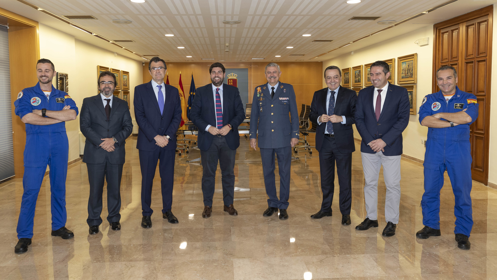 “Será un acto abierto a toda la sociedad, pues a todos nos representa la bandera”, explicó el consejero de Presidencia, Pedro Rivera, al término de esta reunión que tuvo lugar en el Palacio de San Esteban entre el presidente López Miras; el coronel jefe de la Base Aérea de Alcantarilla, Francisco Javier Fernández; el jefe de la PAPEA, capitán José Luis Lomas; los alcaldes de Murcia y Alcantarilla, José Ballesta y Joaquín Buendía; y el presidente de Croem, José María Albarracín.