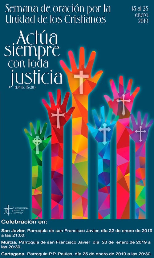 La Diócesis de Cartagena se une a la Semana de Oración por la Unidad de los Cristianos, que tendrá lugar del 18 al 25 de enero, con tres celebraciones ecuménicas. “Actúa siempre con toda justicia” (Dt 16, 18-20) es el lema de este año. Una oportunidad para trabajar por las relaciones interconfesionales de los cristianos. En Cartagena tendrá luga rel día 25 en la parroquia San Vicente de Paúl.