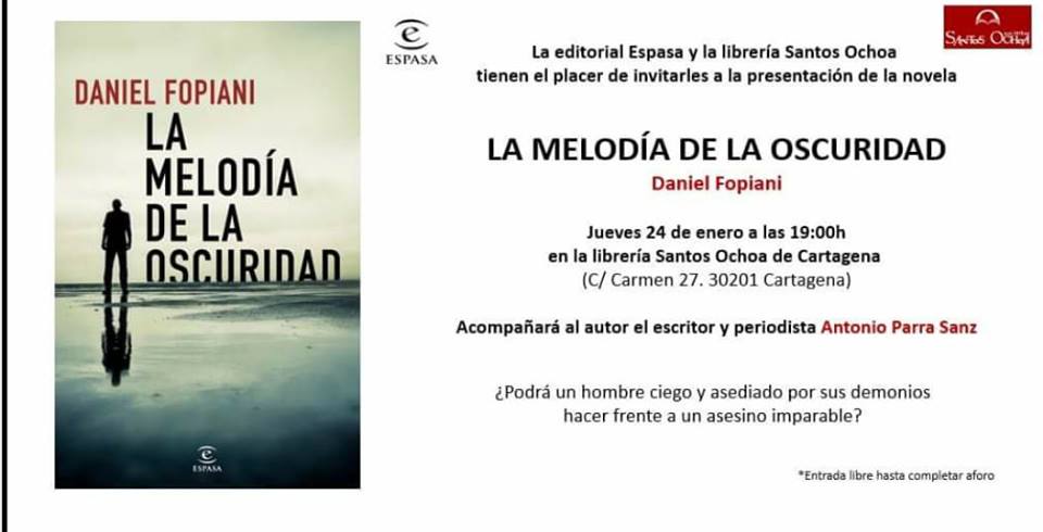 La editorial Espasa y Santos Ochoa presentará este jueves 24,a las 19 horas el libro del escritor Daniel Fopiani 'La melodia de la oscuridad'.