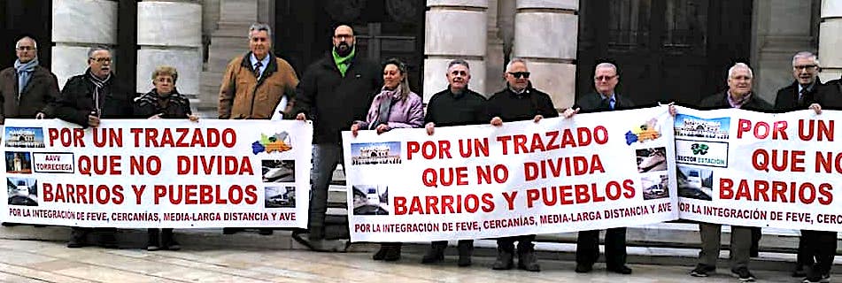 Representantes de la Federación de Asociaciones de Vecinos de Cartagena y de las asociaciones vecinales de los barrios afectados por los proyectos del emplazamiento de la ruta de llegada del AVE, quienes forman la plataforma pro-soterramiento, se han situado esta mañana, antes de las nueve horas, en las escaleras del Palacio Consistorial, donde se está celebrando el Pleno Municipal. Además, convocan a la ciudadanía a la primera concentración que llevarán a cabo el sábado, a las once horas, en el paso a nivel sin barrera situado entre La Palma y Pozo Estrecho.