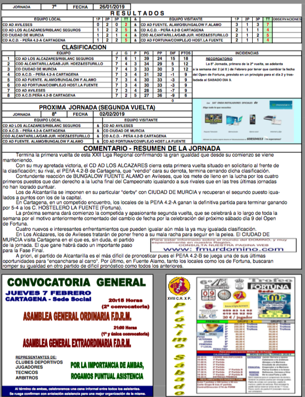 El equipo de la ACD Peña 4.2 A de Cartagena superó al fortuna por 5-4, mientras que el B cayó en Lo Alcázares por idéntico marcador, dentro de la séptima jornada de la Liga Regional. Por otro lado, para este jueves se convocan asambleas generales ordinaria y extraordinaria de la Federación de la Región de Murcia en la sede del club cartagenero.