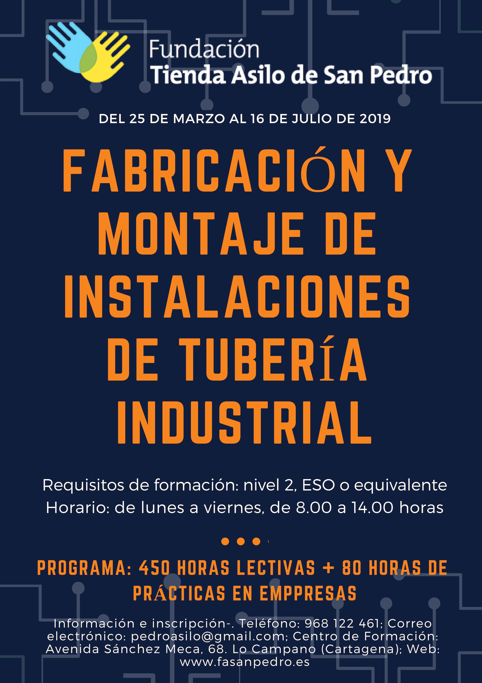 La Fundación Tienda Asilo de San Pedro ha organizado del 25 de marzo al 16 de julio un curso de Fabricación y Montaje de Instalaciones de Tubería Industrial. Para acceder a él el requisito es tener el nivel de 2º de la ESO o equivalente.