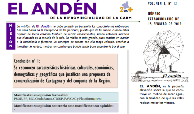 La junta directiva de la Plataforma '2es+' ha acordado publicar de forma extraordinaria y difundir el número 13 del boletín 'El Andén', cuyo contenido versa sobre las noticias que se han tenido sobre el posible 'cierre del proceso de reforma del Estatuto de Autonomía'.