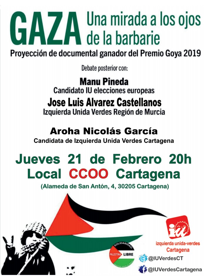 Este próximo jueves 21 de febrero a las 20 horas en la sede de CCOO, se proyectará el documental Gaza como antesala al acto de presentación de Manu Pineda como candidato a las elecciones europeas.