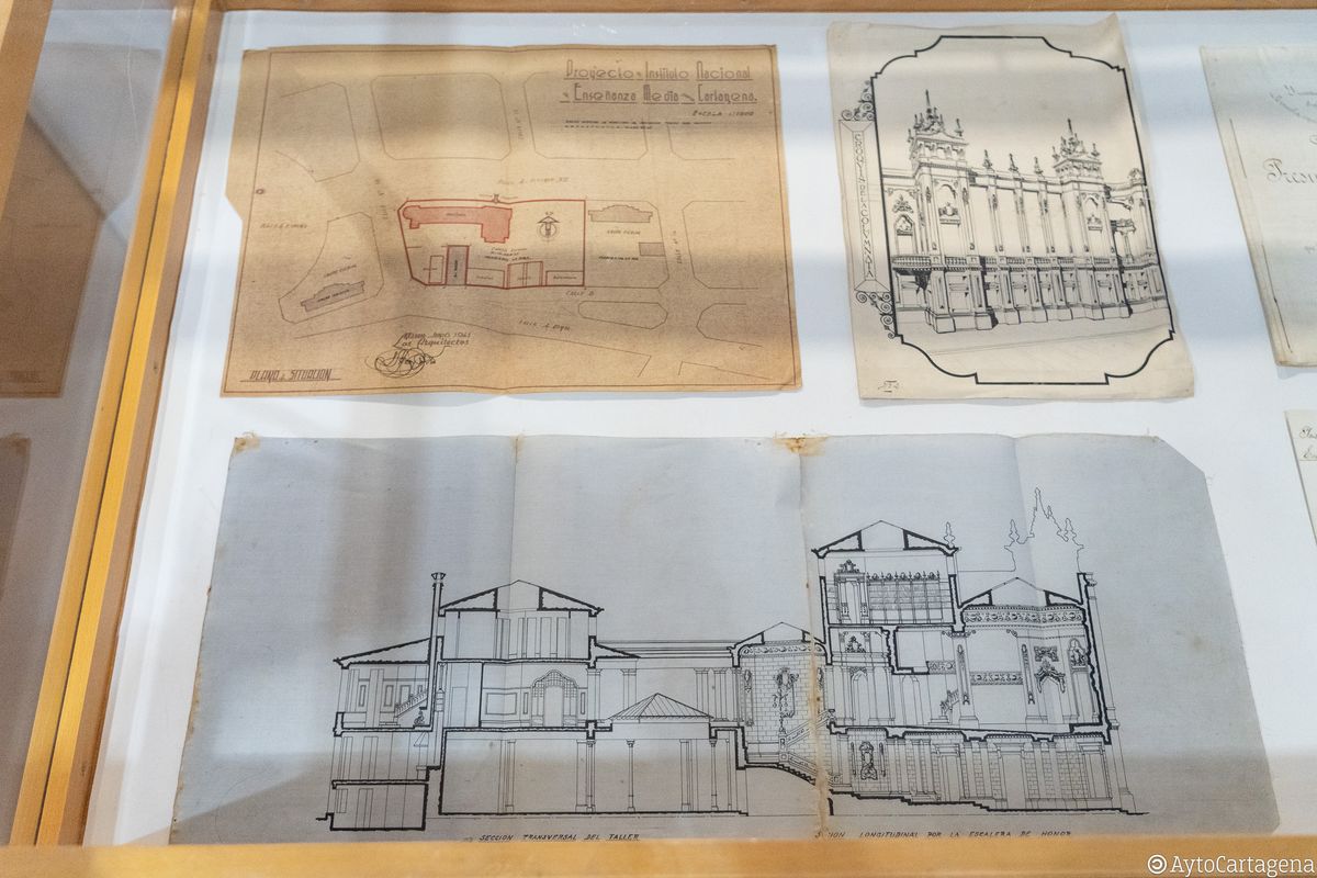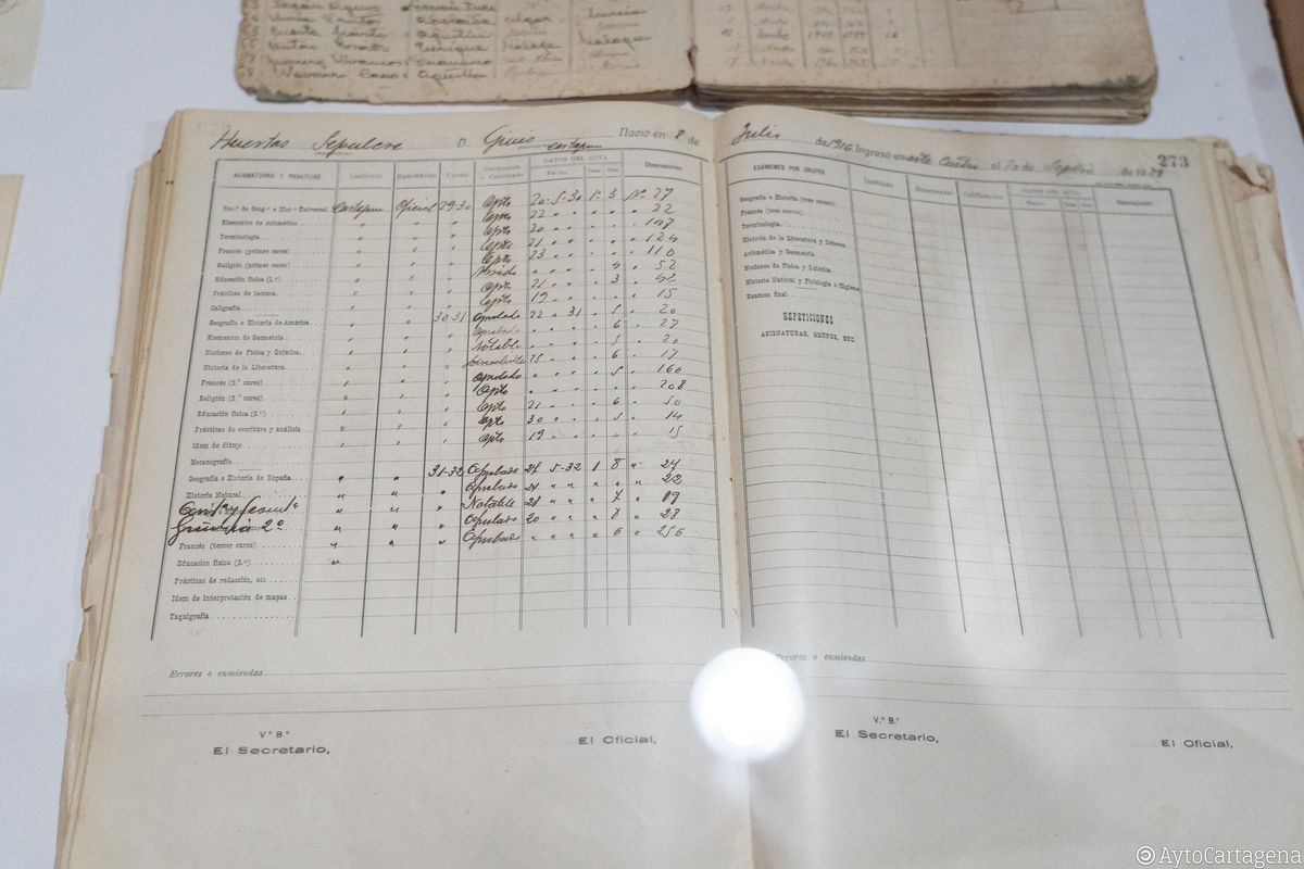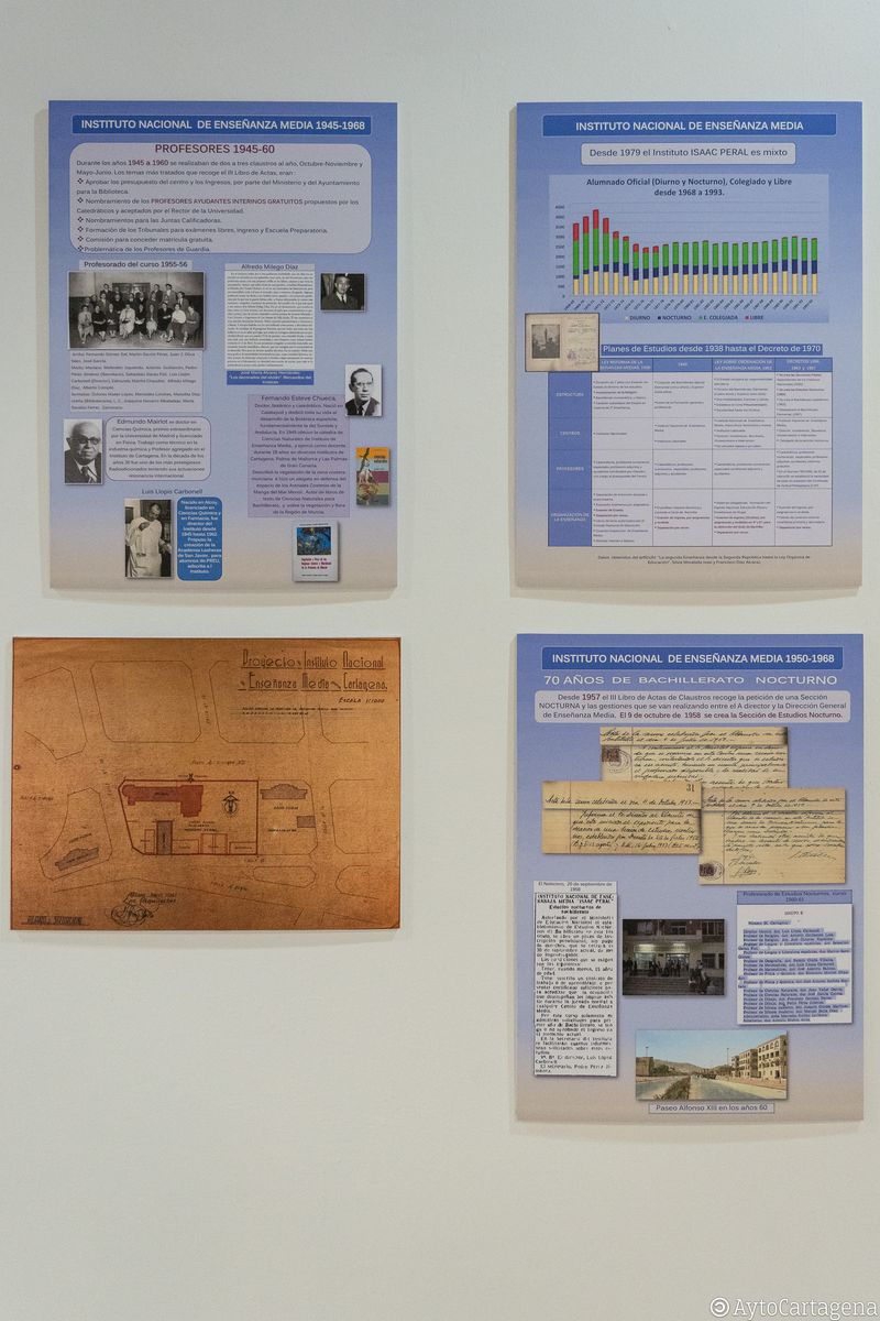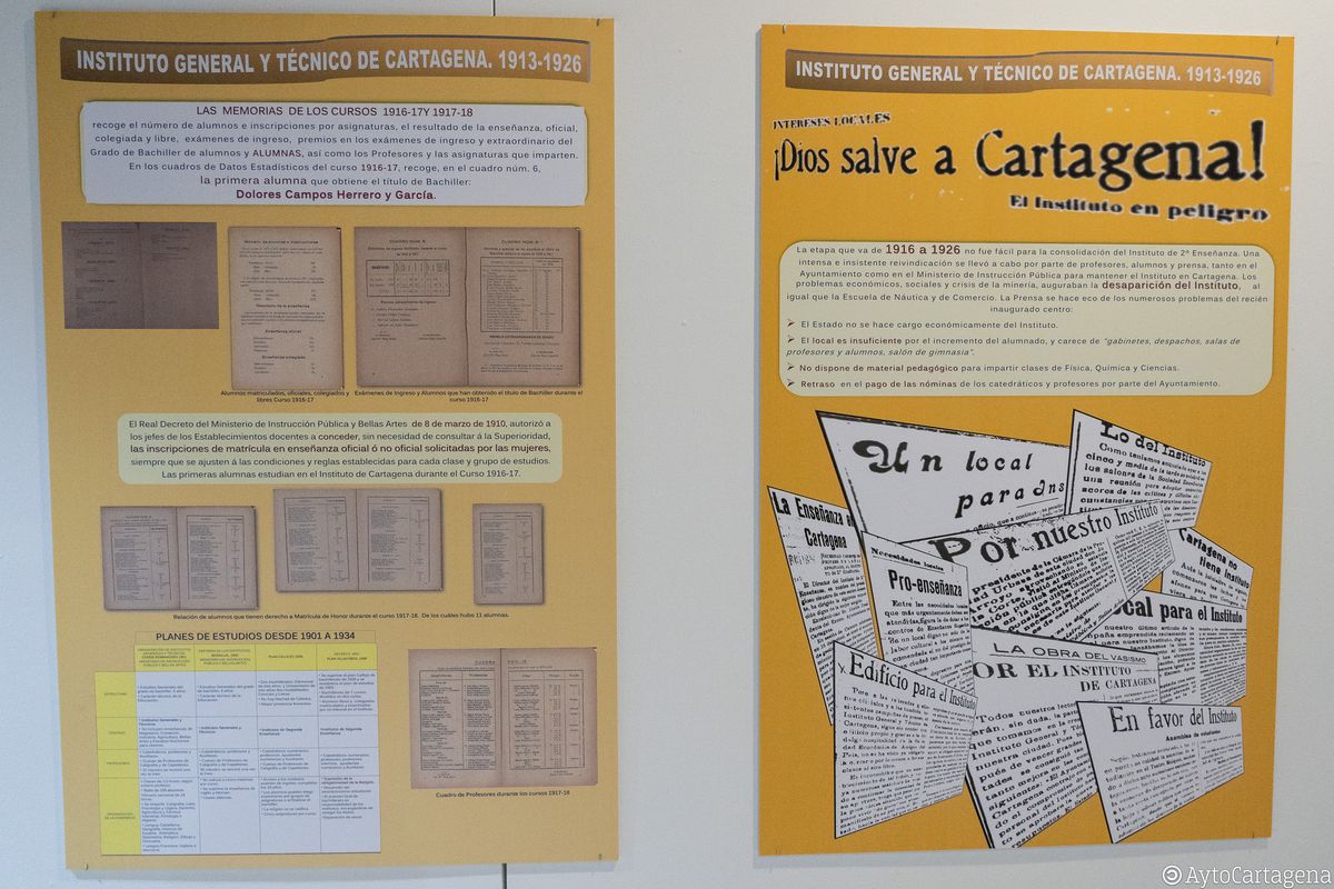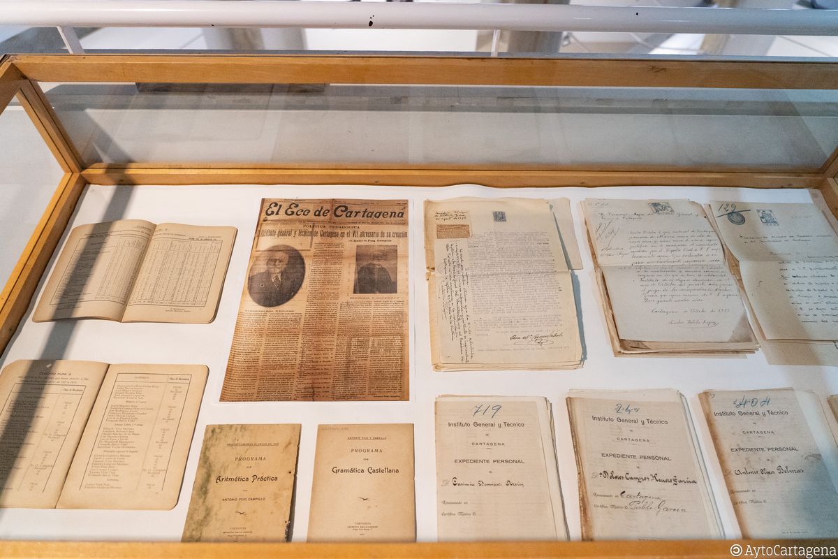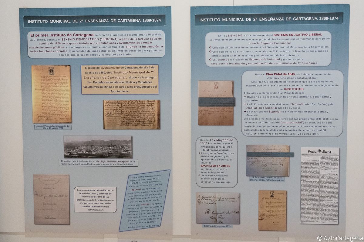 La exposición comienza con el primer instituto de Cartagena, que surgió en 1869, bajo el nombre de Instituto Municipal de 2ª Enseñanza. Dicho centro se encontraba en la sede del colegio La Purísima Concepción, en la calle San Miguel.