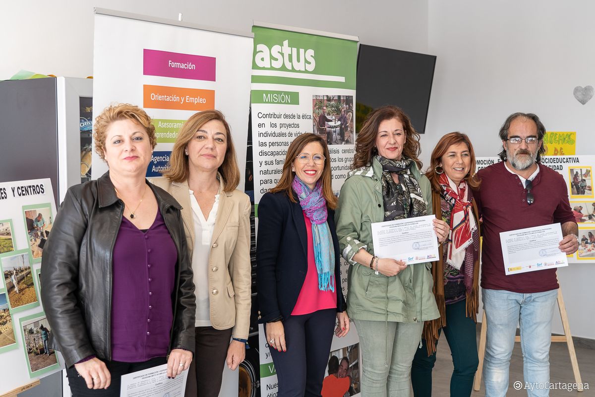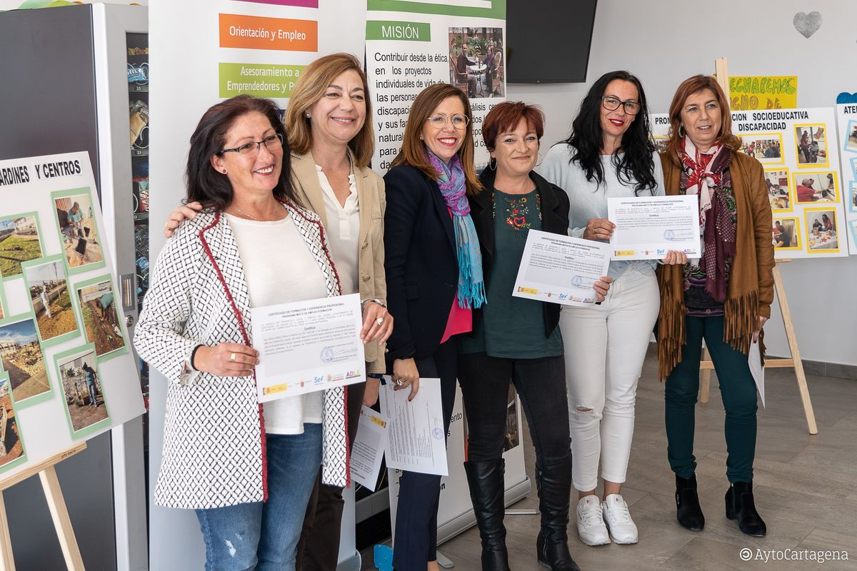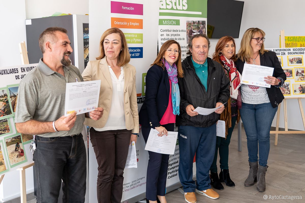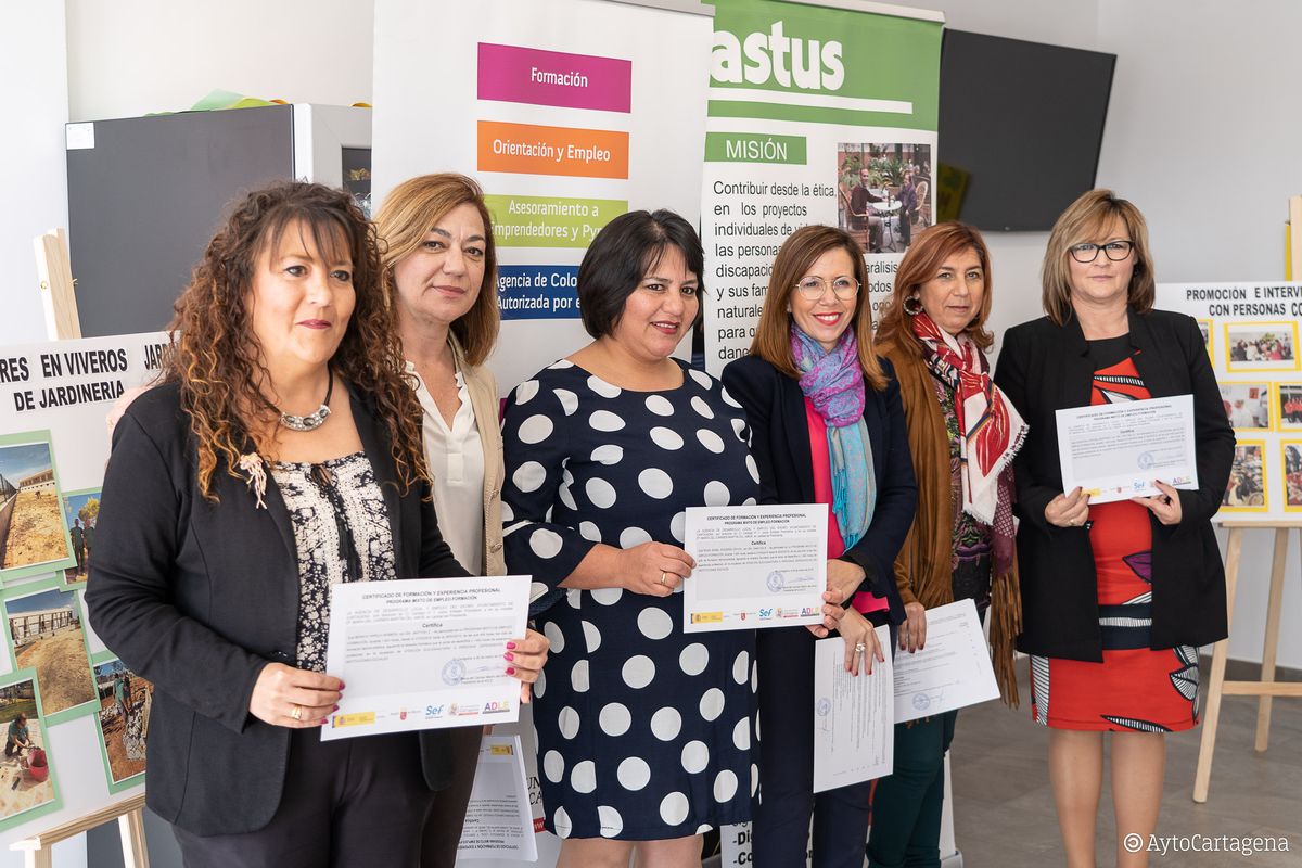 La graduación ha contado con la presencia de la alcaldesa de Cartagena, Ana Belén Castejón, la concejala de Estrategia Económica, Carmen Martín, el gerente de la ADLE, Fulgencio Cerón, la directora del SEF, Severa González y el presidente de la Asociación Tutelar de la Persona con Discapacidad (ASTUS), Joaquín Barberá.