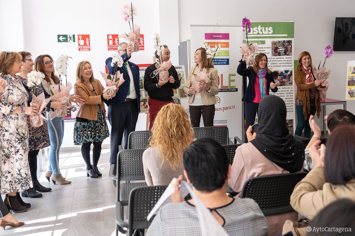 Tras la entrega de diplomas, los alumnos ha entregado a la alcaldesa de Cartagena, a la concejala de Estrategia Económica, al gerente de la ADLE, a la directora del SEF, al presidente de la Asociación Tutelar de la Persona con Discapacidad (ASTUS) y a los formadores orquídeas rosas y blancas como obsequio.