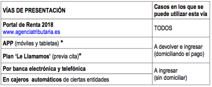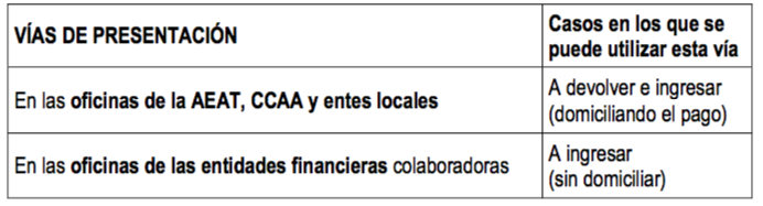Existen varias vías para presentar la declaración, según sea el resultado a devolver o a ingresar, y si se domicilia o no el pago. Domiciliar el pago significa que se puede presentar la declaración de la Renta cualquier día, hasta el 26 de junio, pero el pago no se hará efectivo hasta el 1 de julio, último día de la Campaña de Renta. La domiciliación no impide fraccionar el pago en dos plazos (el segundo, el 5 de noviembre).