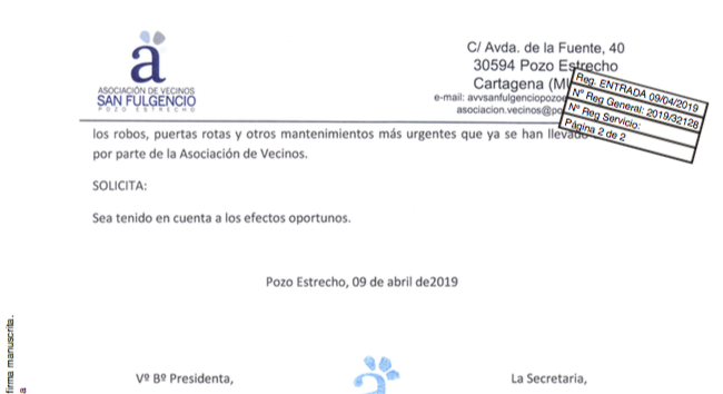 La Asociación de Vecinos San Fulgencio ha presentado un escrito en el ayuntamiento de Cartagena para expresar su desacuerdo con sustituir el espacio de la cantina del centro cívico por una sala de estudio, considerando que hay otras soluciones y prioridades y que no han contado con los vecinos para tomar esa decisión ("Por un interés partidista, una vez más, los vecinos se ven afectados anteponiendo el interés de los políticos a las necesidades reales de la ciudadanía"). En la reunión mantenida con la concejala de Educación, Mercedes García, y técnicos municipales también les han indicado que tienen dos semanas para el desalojo de la cantina, "la cual lleva años cerradas porque no la sacan a concurso pese a que hay gente interesada y que si funcionase permitiría tener un servicio de portería para el centro", exponen.