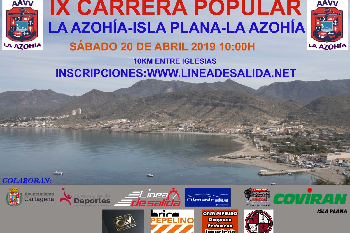 La IX Carrera Popular de La Azohía cuenta con la organización de las Asociaciones de Vecinos de La Azohía e Isla Plana y la colaboración de la Concejalía de Deportes del Ayuntamiento de Cartagena.
