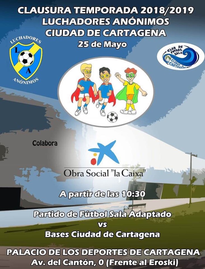 El Palacio de Deportes de la avenida del Cantón acogerá este próximo sábado, a partir de las 10,30 de la mañana, la clausura de la temporada 2018/2019 del club, motivo por el que se ha organizado un partido de futbol sala adaptado entre dicho equipo y las bases Ciudad de Cartagena. Esta será una gran ocasión para que todas aquellas personas que quieran acercarse, puedan conocer más a fondo el trabajo que realizan desde 'Luchadores anónimos'.