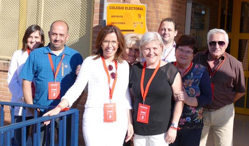 La secretaria general de Cartagena, Ana Belén Castejón, con interventores y apoderados en un colegio electoral ayer