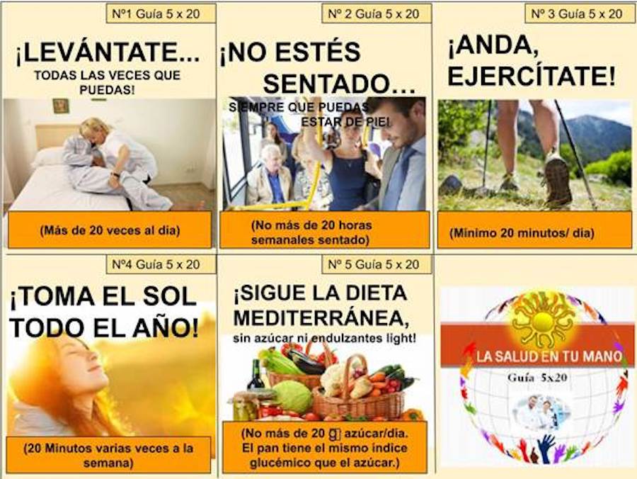 Con el cumplimiento de los cinco consejos asociados de los que consta la citada Guía de Salud 5x20 podemos hacer realidad el eslogan “La salud en tu mano”, ya que contiene lo más importante que está en nuestra mano, hacer o dejar de hacer, muchas veces de una vital importancia más allá de lo que generalmente pensamos. Esta información nos hace poner más atención en la prevención y nos da “motivos para cuidarnos” constantemente, frase que da nombre a la campaña que a primeros del año pasado iniciaron los enfermeros de Medicina Interna del Hospital Universitario Santa Lucía, creadores de la misma.