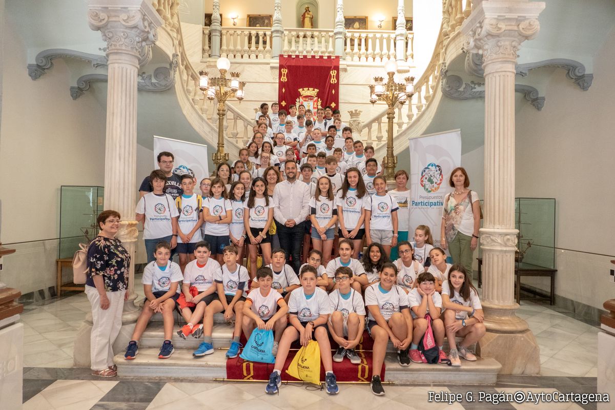 Fue el pasado viernes 31 de mayo cuando los niños y niñas presentaron en la sala de ceremonias su papel durante todo el proceso de los presupuestos, su forma de organizarse y cómo han llevado a cabo la recogida de propuestas y sistemas de votación. Todos ellos recibieron unas camisetas como galardón a su labor durante estos meses con el logo del proyecto, vistiéndolas durante esta mañana en la visita.