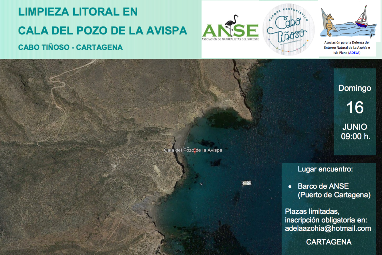 En colaboración con el Parque Ecoturístico de Cabo Tiñoso y la Asociación ANSE, navegaremos con el barco de ANSE hasta esta cala virgen de Cabo Tiñoso, si las condiciones de la mar lo permiten, para realizar una limpieza de residuos de la playa y sus inmediaciones. Inscripción obligatoria y gratuita, exclusiva para SOCIOS voluntarios en: Esta dirección de correo electrónico está siendo protegida contra los robots de spam. Necesita tener JavaScript habilitado para poder verlo.