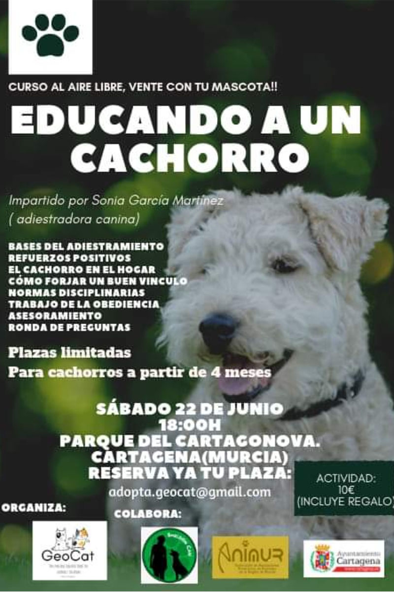 El curso 'Educando a un cachorro' está organizado por la Asociación Protectora Geocat Cartagena, y Animur (Federación de Protectoras de animales de la Región de Murcia) en colaboración con el Ayuntamiento de Cartagena, a través del Laboratorio Municipal de la Concejalía de Estrategia Económica, Sanidad y Bienestar Animal.