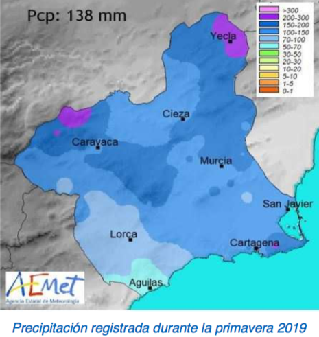 Durante la primavera se registraron más de 200 l/m2 en puntos de la Comarca del Noroeste, Altiplano y Campo de Cartagena. Donde menos precipitación se recogió fue en el suroeste de la Región, con valores ligeramente por encima de los 50 l/m2.