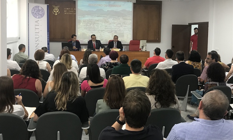 Ante las innumerables dudas planteadas por las empresas con la aplicación del control horario a sus trabajadores, la Cámara de Comercio de Cartagena consideró necesario organizar una jornada informativa, que bajo el título ‘Criterios de la Inspección de Trabajo sobre control horario’, se desarrolló en la sede corporativa cameral. Los más de noventa asistentes tuvieron ocasión de formular cuantas dudas tuvieron respecto a la aplicación de la referida normativa.