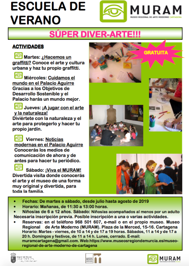 El Museo Regional de Arte Moderno de Cartagena organiza su programa de actividades estivales, totalmente gratuitas y bajo inscripción previa. Para inscripciones: teléfono 968501607, Esta dirección de correo electrónico está siendo protegida contra los robots de spam. Necesita tener JavaScript habilitado para poder verlo. o en el propio museo.