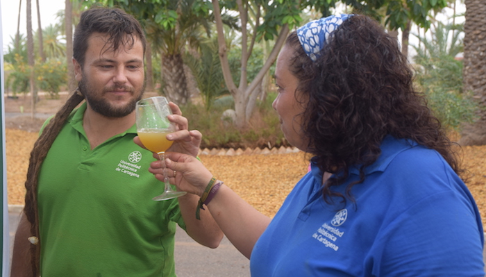 Estudiantes, profesores, personal de la Universidad y usuarios de los Huertos de Ocio de la Universidad de Mayores de la UPCT han vuelto hoy a la finca para colaborar en el prensado de la uva recogida ayer, para lo que han utilizado una prensa de gran capacidad cedida por Bodegas Luzón, que también se espera contribuya a incrementar la calidad del vino, que comenzará a distribuirse a final de este año.
