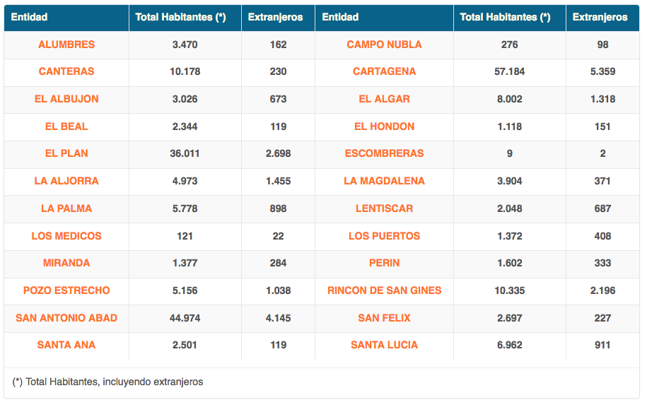 Después de cuatro años de descenso de residentes, la población se sitúa a uno de enero de 2019 en 215.418 vecinos, lo que supone un aumento de 696. Sin embargo, en la ciudad siguen bajando los residentes, con 295 menos habitantes en el último año, dejando el total en 43.194. Barrios y diputaciones aumentan en casi todos los casos, destacando los incrementos en San Antón (255), Rincón de San Ginés (139), El Algar (88) y Santa Lucía (86).