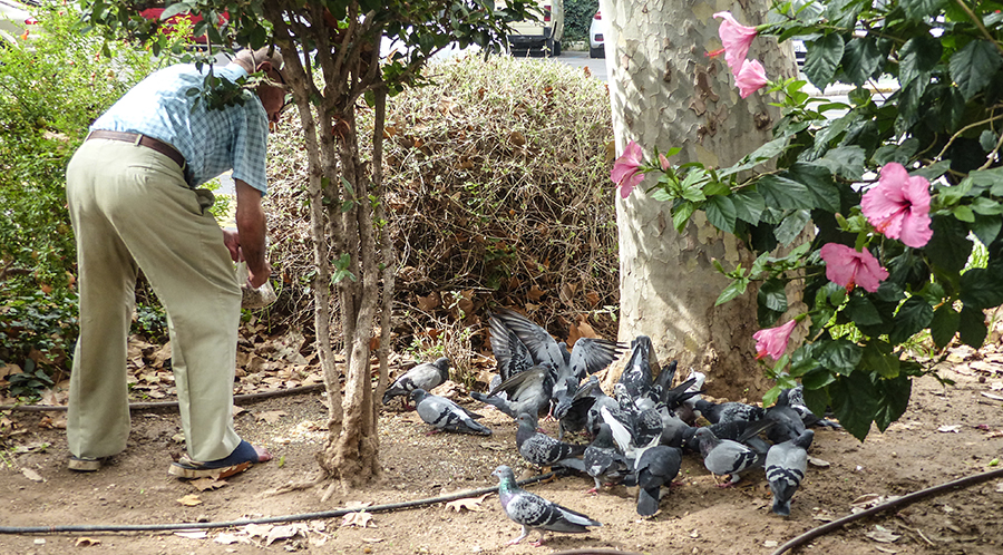 Las aves se dan un festín con las migas de pan que les lleva este vecino del paseo de Alfonso XIII de Cartagena.