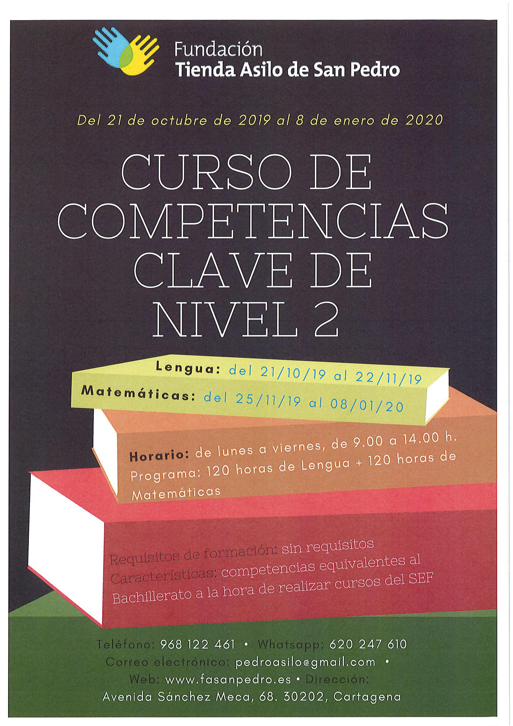 La Tienda Asilo San Pedro organiza un curso de competencias clave nivel 2. El curso comienza el 21 de octubre y finaliza el 8 de enero.