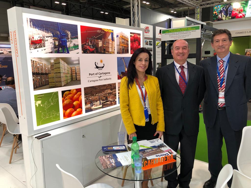 La Autoridad Portuaria de Cartagena asiste a esta cita con stand propio, dentro del espacio de Puertos del Estado. La delegación cartagenera, encabezada por su vicepresidente, Pedro Pablo Hernández, el Director General, Fermín Rol, y el jefe del departamento de Desarrollo de Negocio, Fernando Muñoz, participan en la feria dando a conocer las posibilidades que ofrece el Puerto para la exportación e importación de mercancías y mostrando a los principales agentes del sector las oportunidades que ofrece el Puerto para el transporte de productos hortofrutícolas.