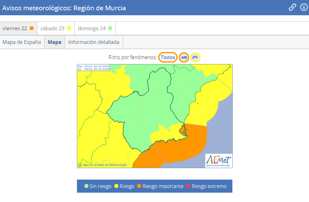 La Agencia Española de Meteorología (AEMET) ha establecido el aviso naranja en toda la costa del municipio de Cartagena por oleaje y fuertes vientos del suroestre de fuerza ocho. La alerta se activará esta tarde sobre las 20 horas y se mantendrá hasta las 24 horas.