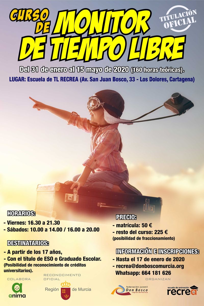 La Escuela de Animación y Tiempo Libre ofrece diferentes cursos. Ya está abierto el plazo para inscribirse en la titulación oficial de monitor de tiempo libre. Hasta el 17 de enero de 2020, los interesados pueden apuntarse en el correo Esta dirección de correo electrónico está siendo protegida contra los robots de spam. Necesita tener JavaScript habilitado para poder verlo. o en el teléfono 664 18 16 26. También está disponible en www.formacionjuventud.carm.es La matrícula cuesta 50 euros y el curso 225 euros, con posibilidad de fraccionamiento de pago. Las entidades sociales tendrán precios especiales y se podrían reconocer créditos universitarios. Se pueden apuntar los mayores de 17 años titulados en Secundaria o con Graduado Escolar. Empezaría el 31 de enero de 2020 y terminaría el 15 de mayo del año que viene. Las clases tendrían lugar los viernes y sábados. Las clases se realizarán en la sede de la escuela, situada en la Avenida San Juan Bosco, 33 de Los Dolores.