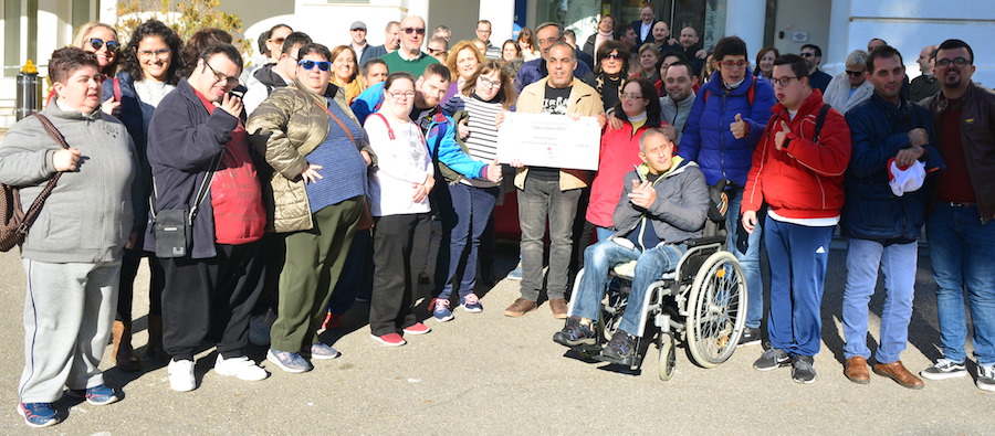 Responsables y usuarios de la Asociación Integral a Personas con Síndrome de Down y a sus Familias de Cartagena han recogido el talón solidario de la iniciativa de trabajadores de la Universidad Politécnica, que han recaudado 3.680 euros para la ONG más votada por los empleados que donan un euro de su nómina mensual.