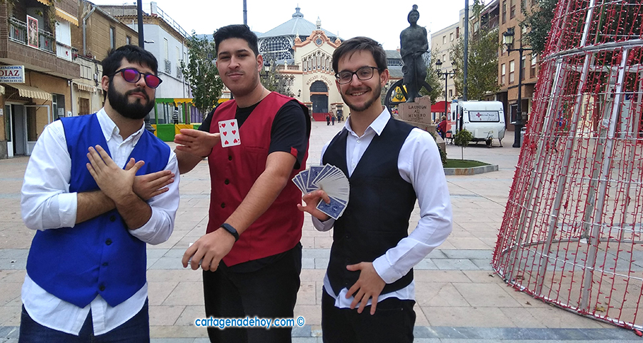 Dos de ellos son vecinos de la zona urbana de la ciudad, mientras que uno es de Molinos Marfagones. Coinciden en que comenzaron a actuar en la magia hace unos ochos años, pero por separado. Ahora, unidos, han creado el trío Neomagic. En la imagen se les observa en La Unión instantes antes de una actuación.