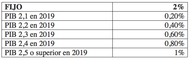 En el caso de la retribución variable del 1% para un crecimiento del PIB igual o superior al 2,5%, el porcentaje de retribución variable disminuirá proporcionalmente a la reducción que se produzca sobre dicho 2,5% (los porcentajes variables según el crecimiento del PIB quedan reflejados en la tabla resumen de incrementos).