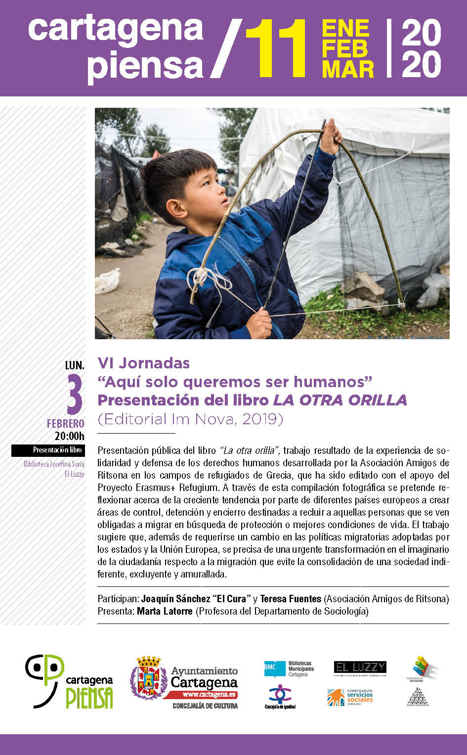 La presentación de la obra que muestra la realidad de las personas refugiadas en los campos de Ritsona y Moria en Grecia tendrá lugar este lunes, a las 20.00 horas, en el centro cultural Ramón Alonso Luzzy, como una de las actividades de las VI Jornadas solidarias 'Aquí sólo queremos ser humanos', enmarcadas en el programa de Cartagena Piensa, organizado por la concejalía de Cultura del Ayuntamiento.